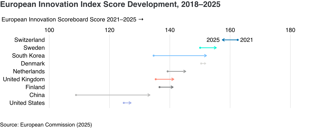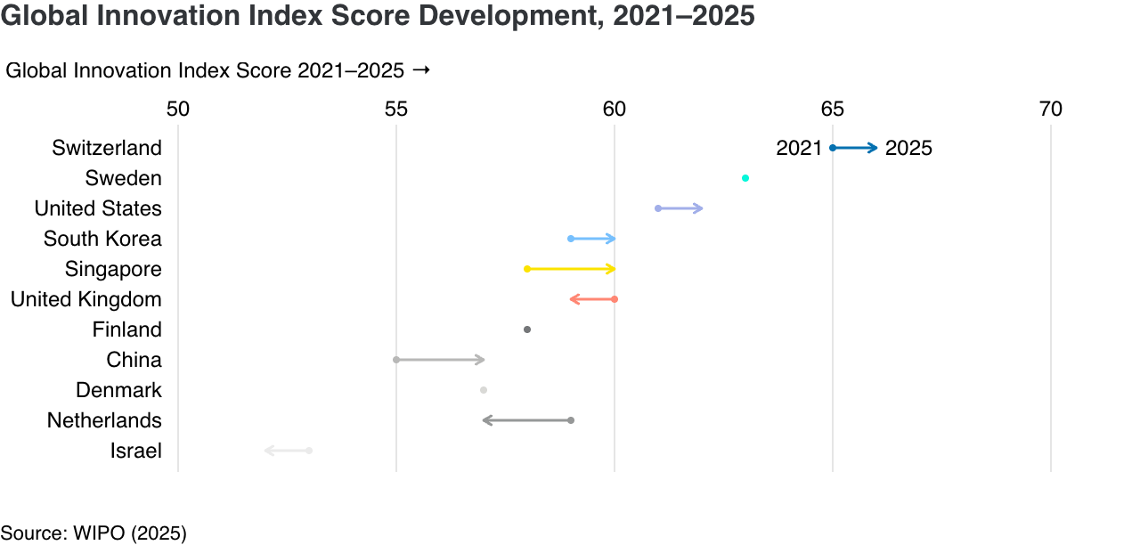 The Global Innovation Index, which uses a broader set of indicators, shows no such convergence and no decline in Swiss innovative power.