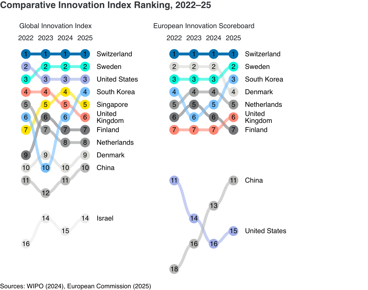 | European Innovation Scoreboard (2018–25) | Global Innovation Index (2021–25) | |
