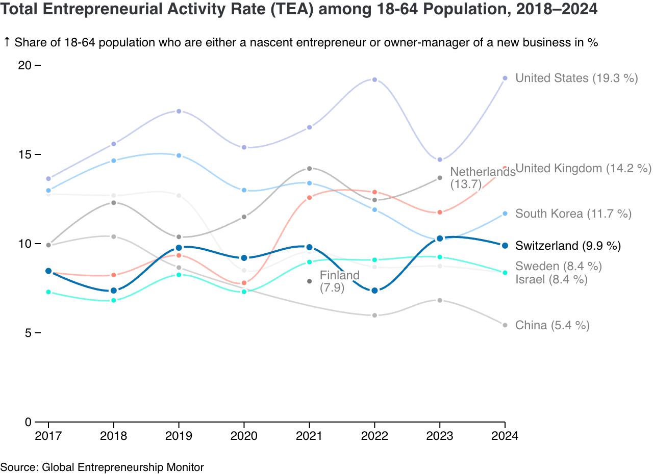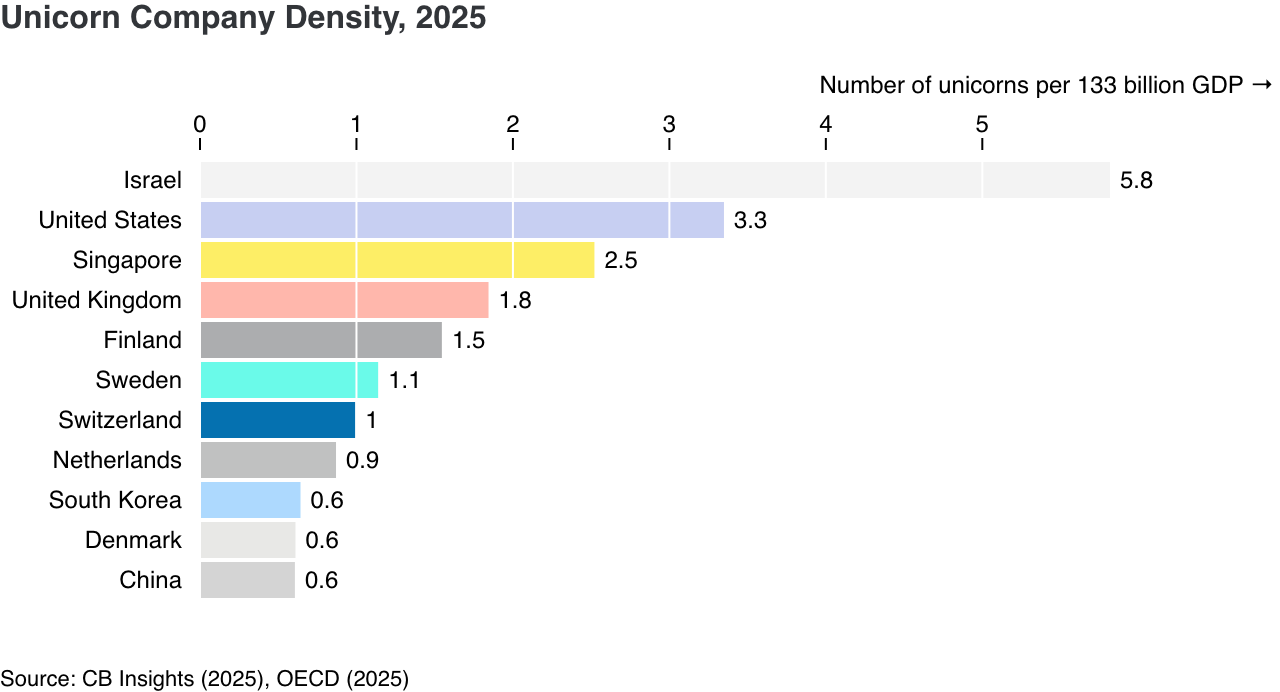 The graph below compares countries' efficiency in creating unicorn companies relative to their economic size, measured as the number of unicorns per $133 billion of GDP. Switzerland produces one unicorn per $133 billion GDP, similar to the Netherlands and Sweden. In contrast, the United States and Israel significantly outperform this benchmark, generating 3-6 times more unicorns relative to their GDP. CB Insights defines a unicorn company, or unicorn startup, as a private company with a valuation over $1 billion.