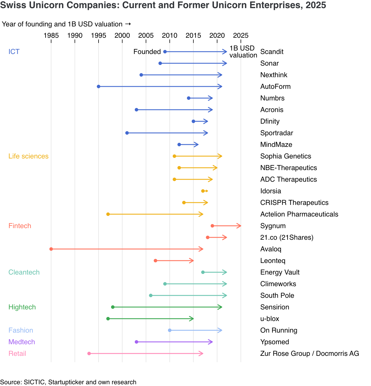 We've also created our own list of Swiss unicorns, including both current unicorns and former ones that have gone public or been acquired, thus some might not meet the strictest unicorn definition. Accordingly, the number is significantly higher than the number in the CB Insights data (28 vs 6). The list is based on the list of the Swiss ICT Investor Club (SICTIC) and has been updated with our own research.